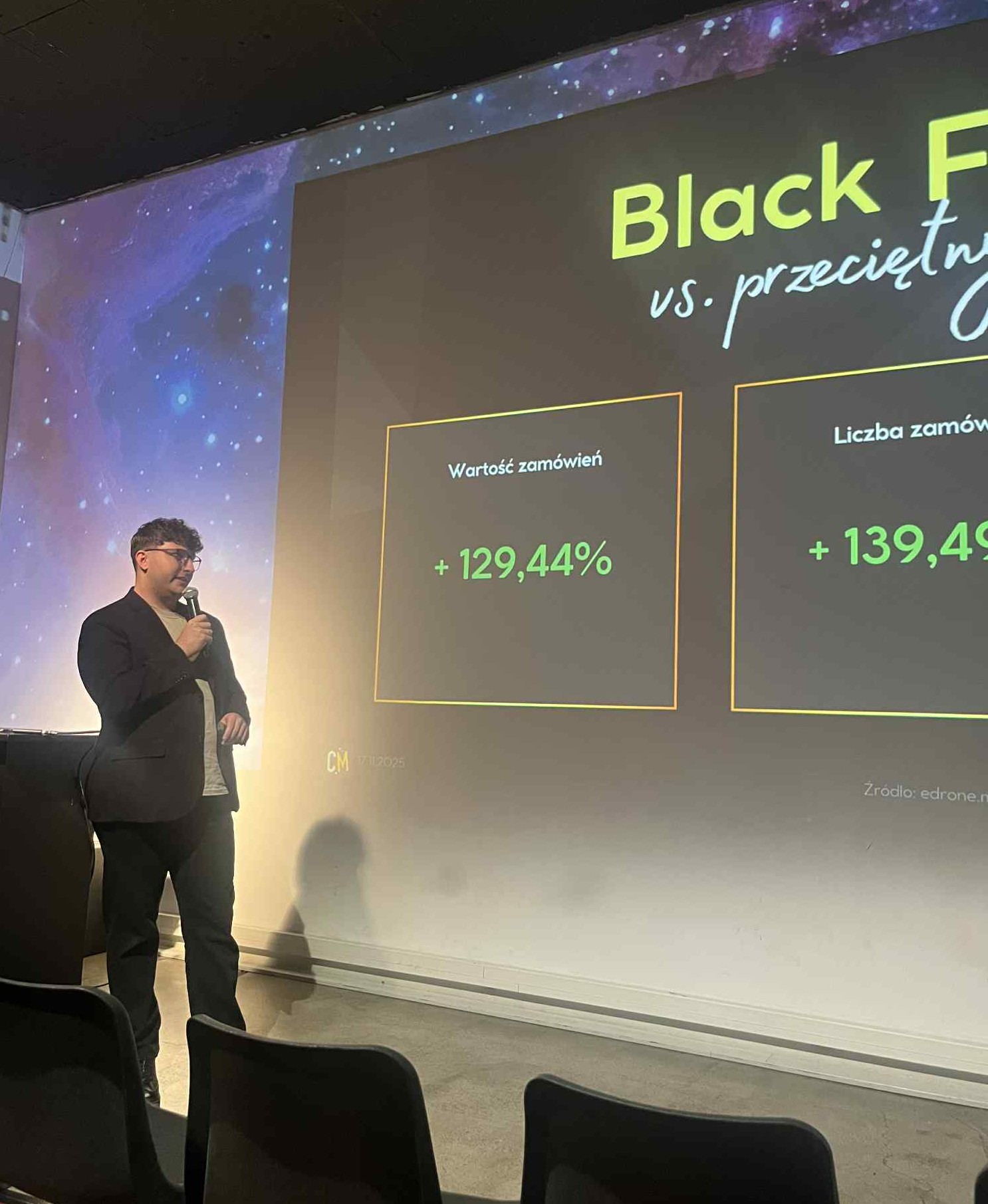 Drugim prelegentem tego wieczoru był Jarosław Pawlik, który podczas swojej prelekcji skupił się na automatyzacji marketingu w e-commerce. Wystąpienie skupiało się na działaniach, które zdążymy podjąć jeszcze przed nadchodzącym Black Friday. Na podstawie pracy z klientami, prelegent podzielił się danymi, które pokazują, że sprzedaż podczas Black Friday znacząco przewyższa wyniki generowane w przeciętny piątek (odnotowując wzrost wartości zamówień o +129,44% i liczby zamówień o +139,49%). W obliczu działań w mocno konkurencyjnym środowisku, wrażliwości cenowej konsumentów oraz rosnących oczekiwań co do personalizacji, kluczowe staje się zastosowanie automatyzacji podczas okresu takiego jak Black Friday do maksymalizacji wyników sprzedażowych w sklepach internetowych. Do najważniejszych strategii MA Jarek zalicza: powitanie nowych subskrybentów, ratowanie porzuconych koszyków, wyświetlanie przeglądanych produktów, rekomendacje (po przeglądaniu lub po zakupie), komunikację po zakupie oraz przywracanie klientów. Wdrożenie tych strategii wymaga segmentacji i personalizacji komunikacji (nie tylko po imieniu, ale też wykonanej akcji czy przeglądanych produktach), a także odpowiedniego timingu. Podczas okresu Black Friday, w przypadku ratowania porzuconych koszyków zalecane jest skrócenie standardowego czasu reakcji (np. pierwszy e-mail po 1 godzinie zamiast po 3 godzinach). Skuteczność automatyzacji została potwierdzona na podstawie konkretnych sklepów internetowych.