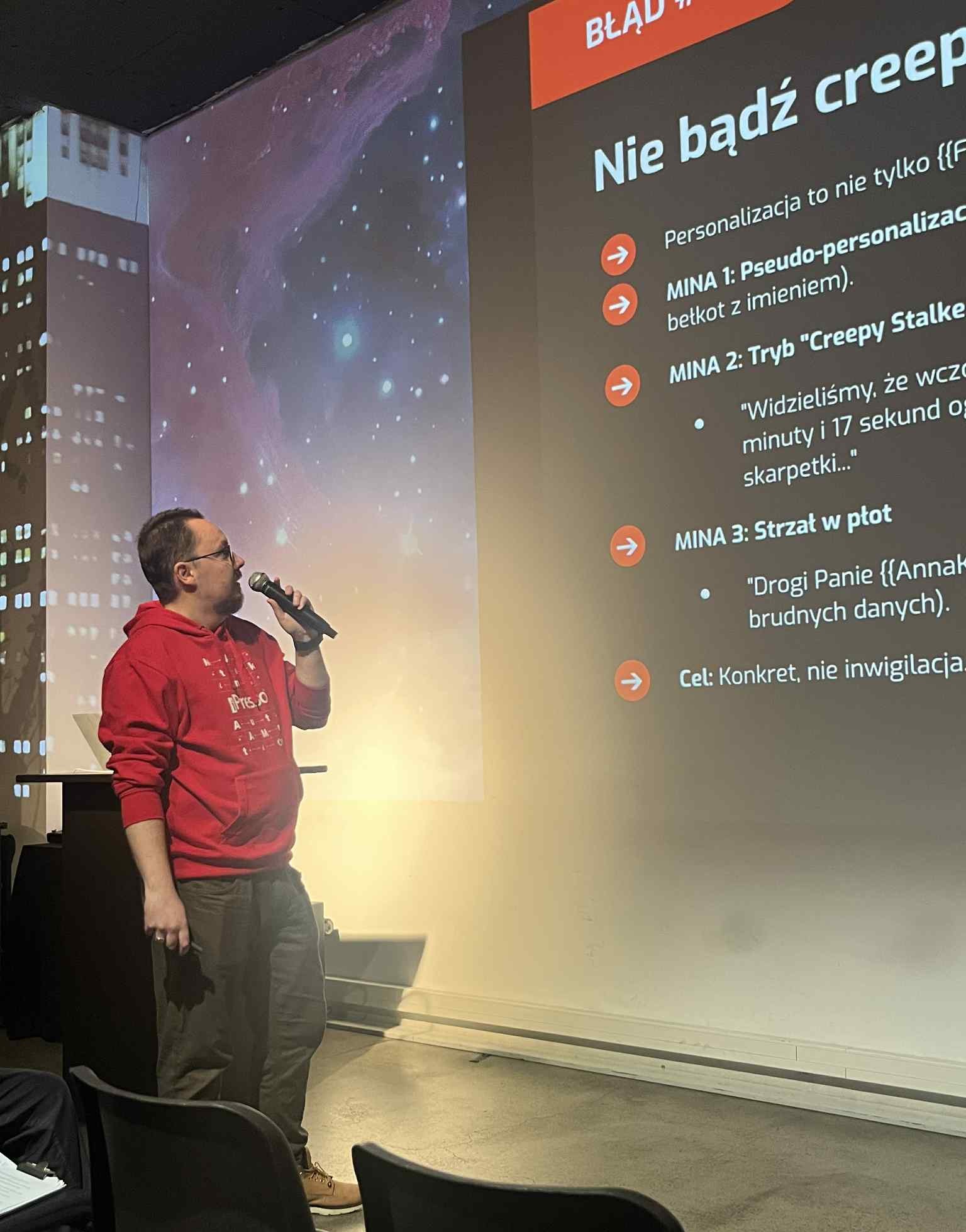 Jako pierwszy tego wieczoru wystąpił Jakub Wyciślik. Podczas swojego wystąpienia skupił się na identyfikacji i omówieniu 13 najczęstszych błędów, które prowadzą do niepowodzenia działań związanych z Marketing Automation (MA). Prelegent podkreślił, że aż 80% firm popełnia te same błędy, na najważniejszym z nich jest brak przygotowanej strategii. Firmy często decydują się na wdrażanie MA, ponieważ „konkurencja ma”, przez co system staje się drogim gadżetem, który generuje koszty, a nie wyniki. Równie nagminne okazały się kwestie wewnętrznych procedur, które często są pomijane. Mowa tutaj w szczególności o jakości danych (zasada GIGO: „Garbage In, Garbage Out”) oraz braku komunikacji między działami marketingu, sprzedaży i obsługi klienta. Należy pamiętać, że MA jest grą zespołową, a wymiana informacji między działami jest tutaj kluczowa. Ostatnie istotne rady dotyczyły zachowania równowagi: należy dbać o optymalizację, ale unikać syndromu „Set & Forget”, a także stawiać na konkretną personalizację, kiedy decydujemy się na rozwiązania marketing automation.