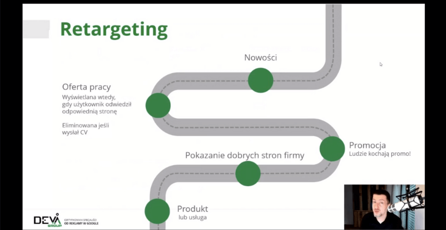 Zwracajmy też uwagę na analitykę, oraz konwersje – nie tylko te makro (jak wysłanie CV) ale również mikro, takie jak pobranie e-booka w PDF, zapis na newsletter, czy spędzenie 5 minut na stronie – na podstawie takiej informacji możemy wzmocnić przekaz remarketingowy bądź wzmocnić stawki reklamowe dla takiej osoby.