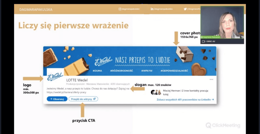Dagmara Pakulska, założycielka min. Niby-Prasówki w swojej prezentacji opowiadała o sile LinkedIna – który wciąż rośnie i staje się naprawdę mocnym graczem na social mediowej scenie. Na początek pokazała uczestnikom krok po kroku jak założyć na LinkedInie profil firmowy. Jak widać na poniższym screenie – liczy się pierwsze wrażenie. Spójność i przejrzystość profilu to podstawa. Warto zwrócić również uwagę na fakt, że zdjęcie w tle na LinkedIn ma inne wymiary niż to, które możemy zauważyć na Facebooku.