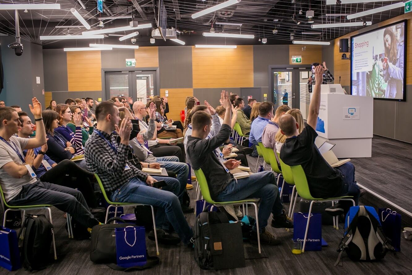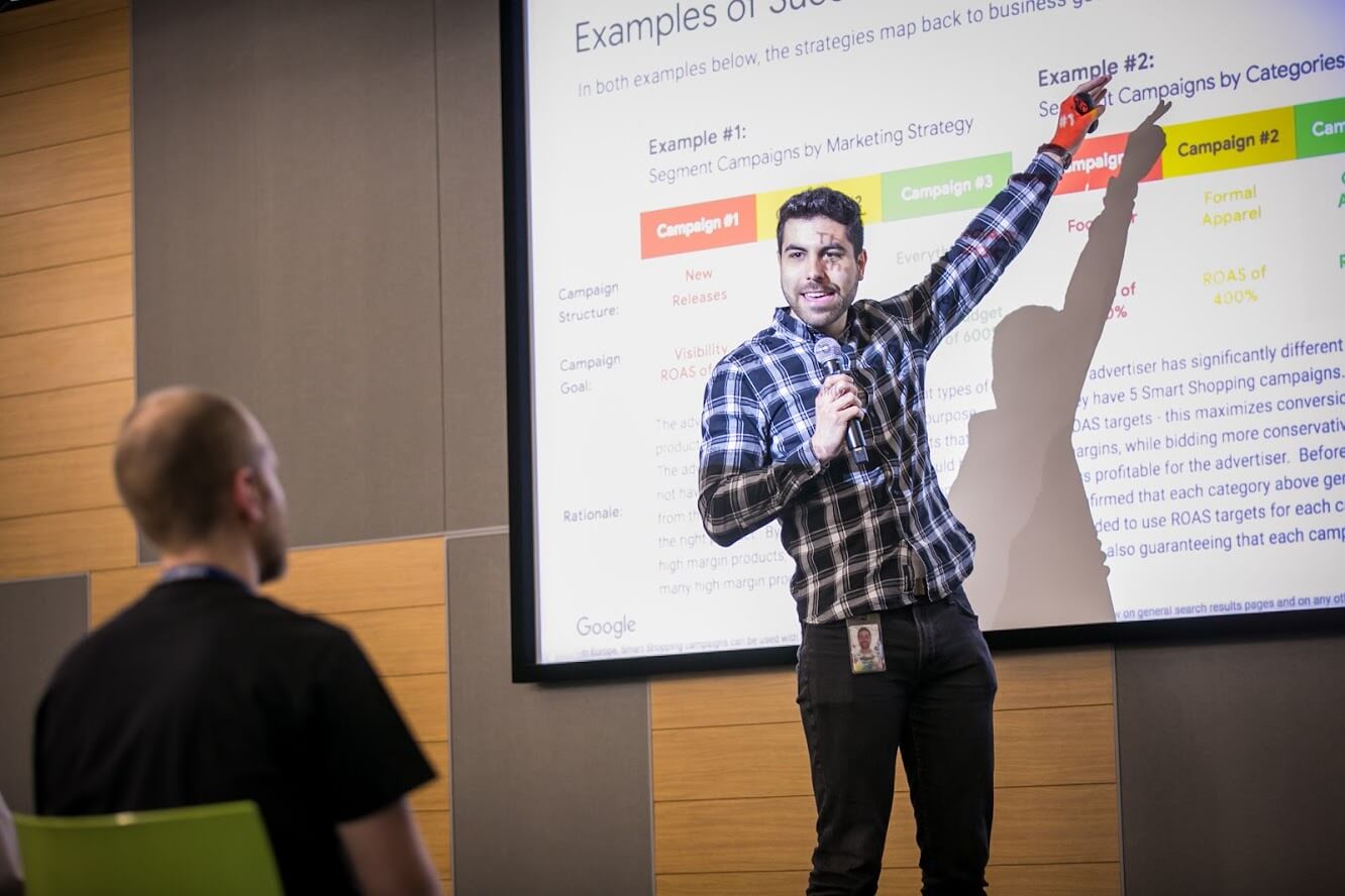 Na scenie w warszawskiej siedzibie Google wystąpił Artur Mosiak, świetny ekspert z zakresu smart biddingu z prezentacją na temat kampanii inteligentnych. Artur Mosiak zapowiedział nowe funkcjonalności dotyczące automatyzacji, pokazał dobre praktyki tworzenia automatycznych kampanii oraz najczęstsze błędy. Miguel Herrera przekazał ogromną porcję wiedzy na temat Smart Shoppping. Przedstawił m.in. cenne informacje, jak tworzyć kampanie Smart Shopping w zależności od celu działań, jak optymalizować kampanie i co testować w kampaniach. Daria Jarczewska, która wspiera rozwój naszych klientów, odsłoniła tajniki Wyniku optymalizacji, a Paweł Dalecki z Verseo pokazał, jak automatyzacja działa w jego agencji.
