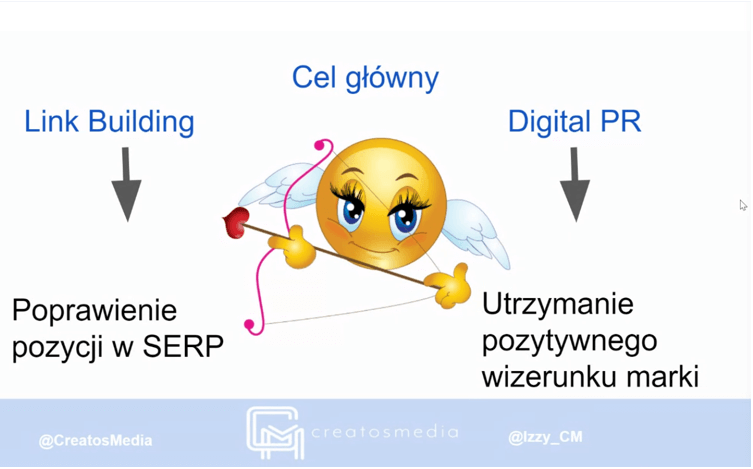 Kolejna osoba, która pojawiła się na wirtualnej scenie konferencji semKRK to Izabela Wiśniewska. Swoje wystąpienie zaczęła od wyjaśnienia terminu Digital PR – jest to utrzymanie pozytywnego wizerunku marki przez linki, mentions i social media presence.