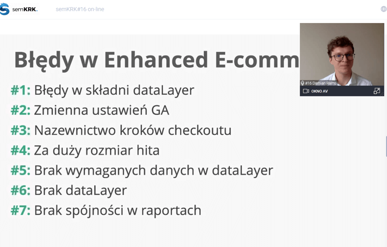 Drugim prelegentem był Damian Rams, który opowiedział o najczęstszych problemach z działaniem Enhanced E-commerce. Dzięki tej funkcjonalności otrzymujemy więcej możliwości optymalizacji w sklepie: