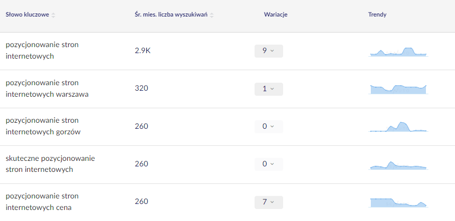 Narzędzie to umożliwia również analizowanie fraz kluczowych pod względem ich popularności w Google. Dane te dostępne są w raporcie „Baza słów kluczowych”, który wygląda w następujący sposób: