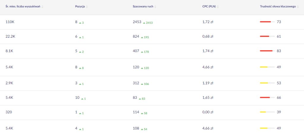 Dzięki platformom takim jak Senuto możemy śledzić również wzrosty oraz spadki widoczności naszej witryny na konkretne frazy kluczowe. Widać to na poniższym screenie: