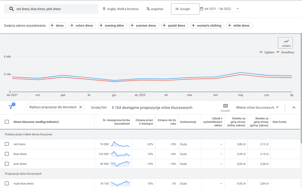 Powyższe narzędzia to tylko jedne z wielu dostępnych opcji, dzięki którym można znaleźć interesujące słowa kluczowe. Posiadając jedną frazę kluczową, taką jak “red dress”, aplikacje dostarczają wiele nowych słów w przeróżnych kombinacjach, które możemy wykorzystać w kampaniach w sieci wyszukiwania. Ponadto, średnia liczba wyszukiwań umożliwia nam wstępne oszacowanie, które frazy lepiej wykorzystać w kampaniach.