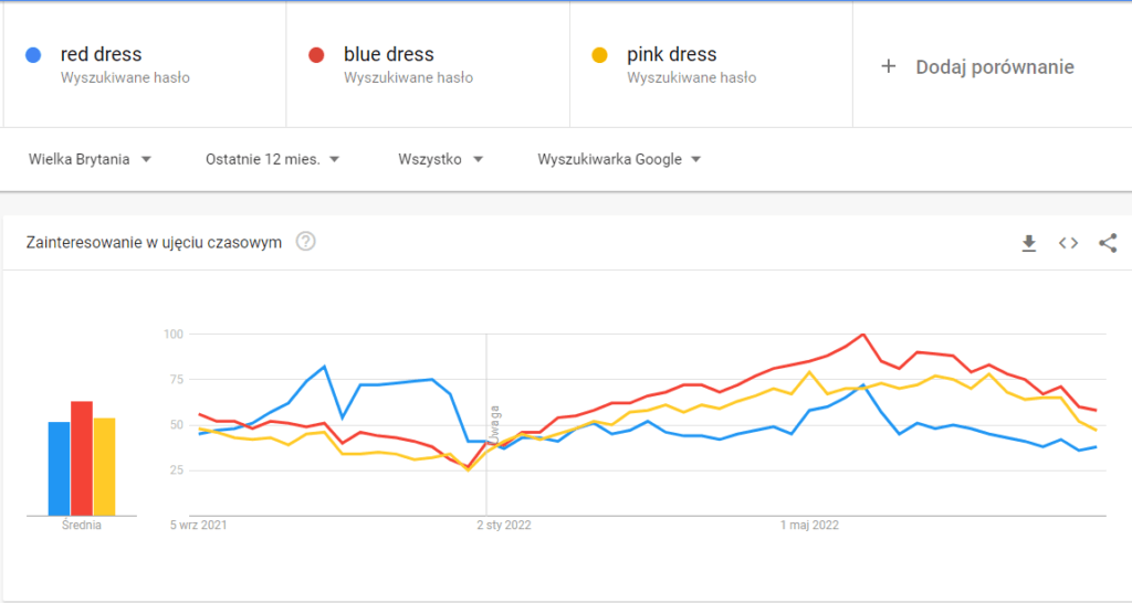 Kolejnym bezpłatnym narzędziem od Google, które możemy wykorzystać podczas wyszukiwania zagranicznych słów kluczowych są Trendy Google. Dzięki niemu można sprawdzić popularne wyszukiwania w danym kraju oraz porównać liczbę wyszukiwań wpisanych fraz w wybranym okresie.