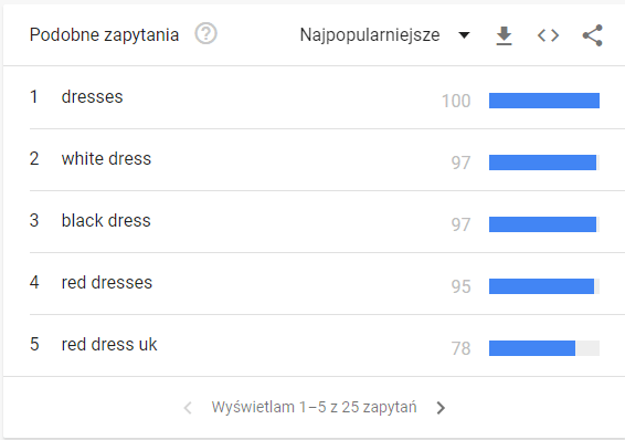 Google Trends pokazuje również inne wyszukiwania związane z konkretnymi frazami kluczowymi, dzięki którym możemy poznać często wyszukiwane słowa, które mogą okazać się przydatne podczas tworzenia naszej kampanii.