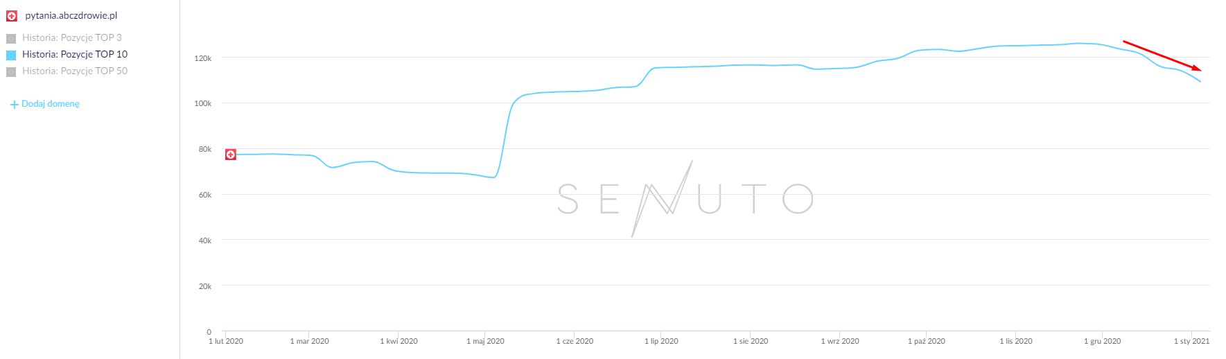Serwis pytania.abczdrowie.pl odnotował spadek widoczności o ponad 11 procent, przy ilościowym spadku o 14303 słów kluczowych (pomiędzy pierwszym poniedziałkiem stycznia a pierwszym poniedziałkiem grudnia).