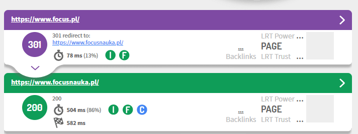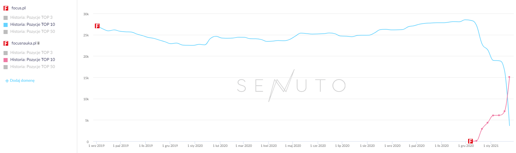 Na odstawie danych z Webarchive – widzimy, że między 29/11 (ostatni skan focus.pl) a 22/12 (pierwszy skan z przekierowaniem) nastąpiło przeniesienie serwisu na nową domenę. Sprawdźmy, czy udało się przenieść całą widoczność 1:1: