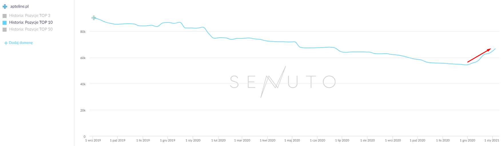 Jednym z serwisów, który odnotował duży wzrost liczby słów kluczowych w TOP10 (również procentowo), jest portal apteline.pl. Nastąpił wzrost o ponad 19% – miesiąc do miesiąca.