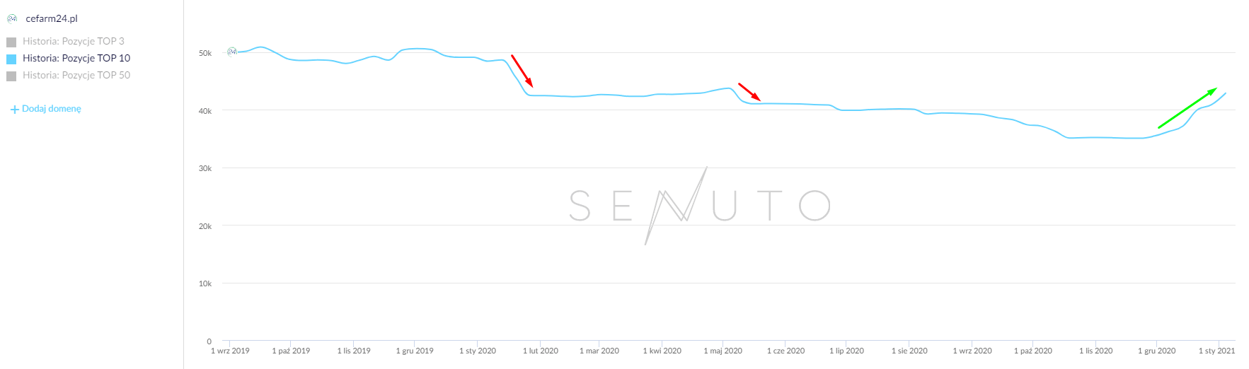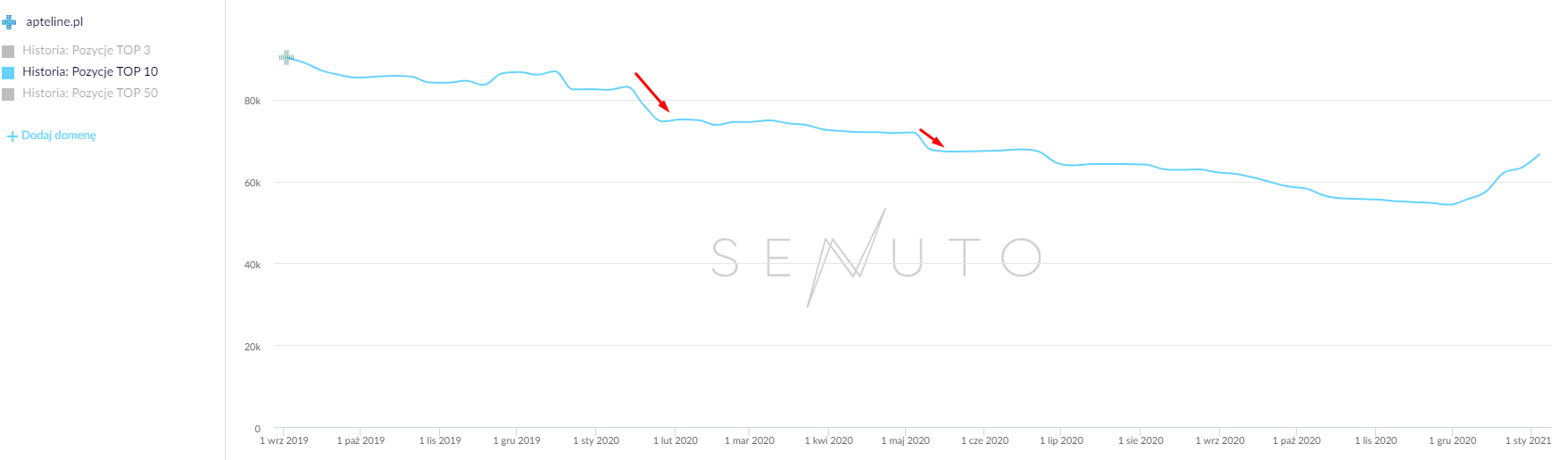 Na ten moment nadal nie odzyskano widoczności – okres jest też dość krótki, by oceniać efekty. Warto porównać te wykresy widoczności w TOP10 za 2-3 miesiąca.