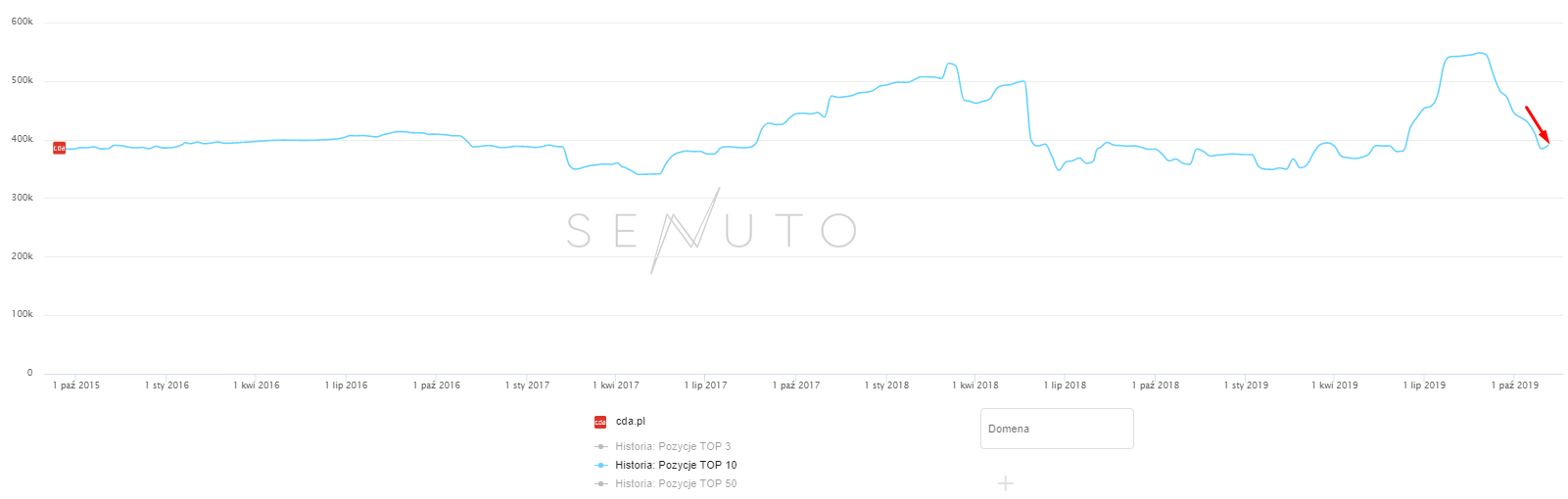 Serwis Cda.pl odnotował spadek widoczności o ponad 11 procent, przy ilościowym spadku o 47552 słowa kluczowe (pomiędzy pierwszym poniedziałkiem października a pierwszym poniedziałkiem listopada).