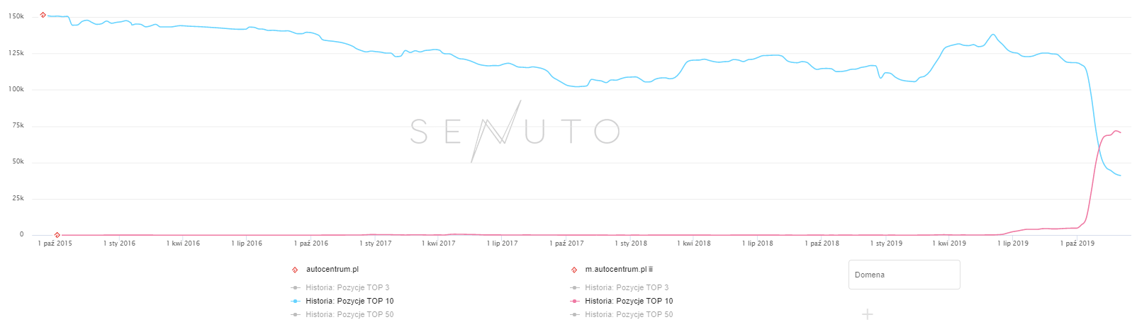 Wniosek z tych danych jest jeden – widoczność utrzymuje się wewnątrz serwisu ale następuje przesunięcie między domeną a jej subdomenami. Widać to na przykładzie m.autocentrum.pl: