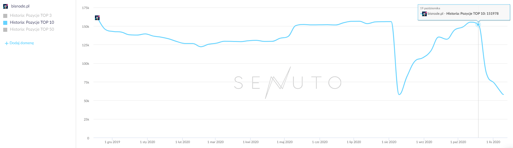 Serwis bisnode.pl odnotował spadek widoczności o ponad 50 procent, przy ilościowym spadku o 75407 słów kluczowych (pomiędzy pierwszym poniedziałkiem listopada a pierwszym poniedziałkiem października).