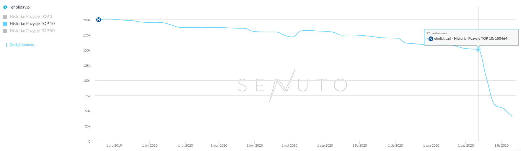 Widoczność serwisu w TOP10 na początku listopada była mniejsza o 63345fraz (zmniejszyła się o ponad 80% w stosunku do początku października).