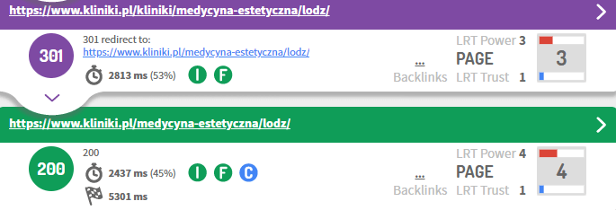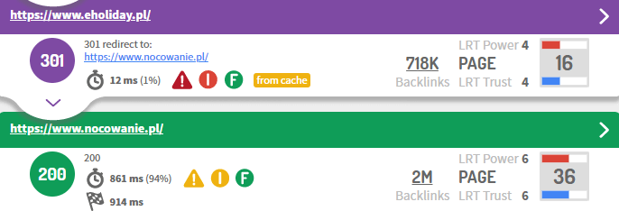 Wzrost widoczności następuje prawie od zera, co sugeruje, iż jest to nowy serwis. Skala wzrostu sugeruje też, że stoi za tym przekierowanie 301. Hipoteza ta potwierdza się podczas n/w analizy:
