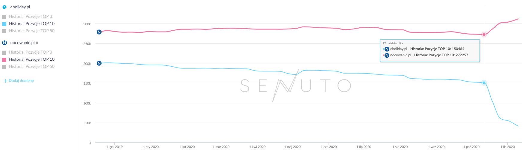 Artykuł ten powstał we współpracy z SENUTO, na podstawie zbieranych danych dotyczących widoczności domen w Google. Do porównywania widoczności miesiąc do miesiąca, wykorzystaliśmy ilość słów kluczowych w TOP10, która została pobrana w każdy pierwszy poniedziałek miesiąca. Daje to nam możliwość porównania zarówno ilościowej różnicy liczby słów, jak i procentowego wzrostu/spadku – dla wszystkich badanych przez SENUTO słów kluczowych.