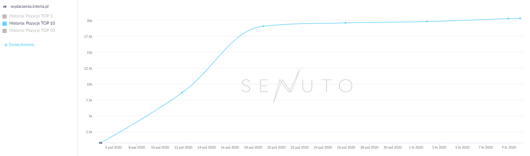 Jednym z serwisów, który odnotował duży wzrost liczby słów kluczowych w TOP10 (również procentowo), jest portal wydarzenia.interia.pl. Jest to wzrost o ponad 2500% – miesiąc do miesiąca.