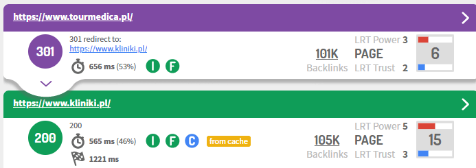Jak widzimy na powyższej grafice, serwis Kliniki.pl po przekierowaniu 301, posiada jeszcze wyższą widoczność, niż wcześniejsza domena tourmedica.pl – jednym zdaniem, migracja udana 🙂