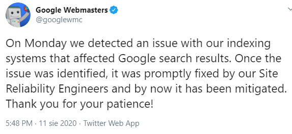 W dniu 11 i 12 sierpnia Google poinformowało o problemach z indeksacją podstron w wynikach wyszukiwania – na co chwilę wcześniej zwróciła branża SEO.