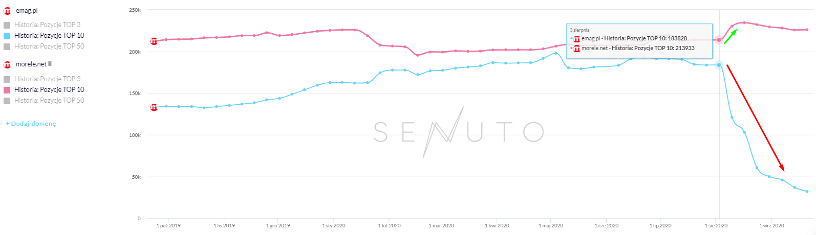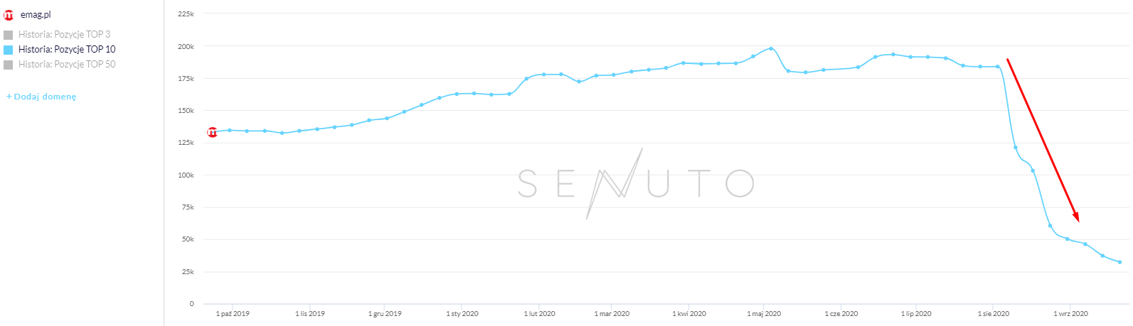 Serwis emag.pl odnotował spadek widoczności o ponad 70 procent, przy ilościowym spadku o 116294 słów kluczowych (pomiędzy pierwszym poniedziałkiem września a pierwszym poniedziałkiem sierpnia).
