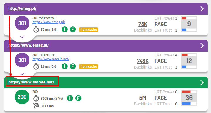 Jak widzimy powyżej – przekierowanie 301 wpłynęło pozytywnie ale nie 1:1. Dlaczego? Domena morele.net była wcześniej widoczna na większość fraz i stąd nie pojawiła się taka sama liczba nowych fraz, co liczba utraconej widoczności emag.pl