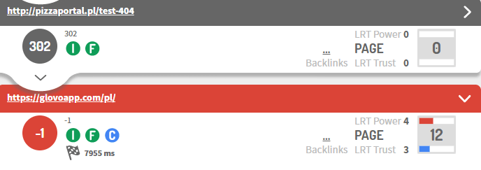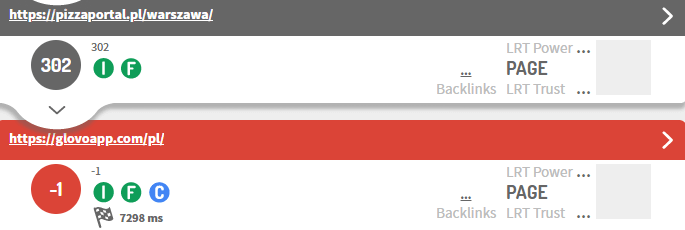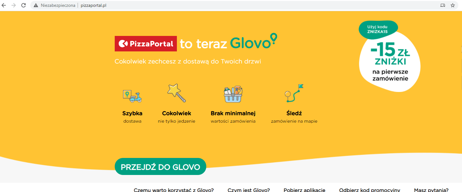 Strona główna nadal jest aktywna i znajduje się na niej informacja o zmianach dt. brandu. Możemy jednak bardzo szybko zauważyć, że podstrony nie zostały pozostawione jako 404. Są przekierowane na polską wersję serwisu glovoapp.com/pl z użyciem kodu 302.
