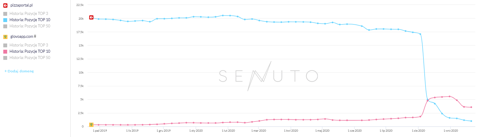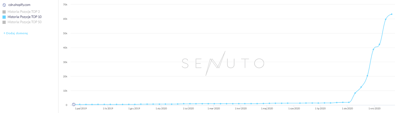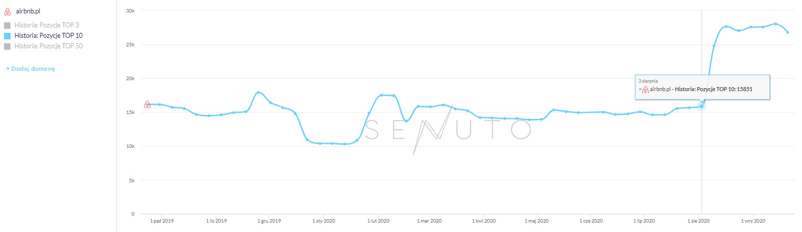 Artykuł ten powstał we współpracy z SENUTO, na podstawie zbieranych danych dotyczących widoczności domen w Google. Do porównywania widoczności miesiąc do miesiąca, wykorzystaliśmy ilość słów kluczowych w TOP10, która została pobrana w każdy pierwszy poniedziałek miesiąca. Daje to nam możliwość porównania zarówno ilościowej różnicy liczby słów, jak i procentowego wzrostu/spadku – dla wszystkich badanych przez SENUTO słów kluczowych.