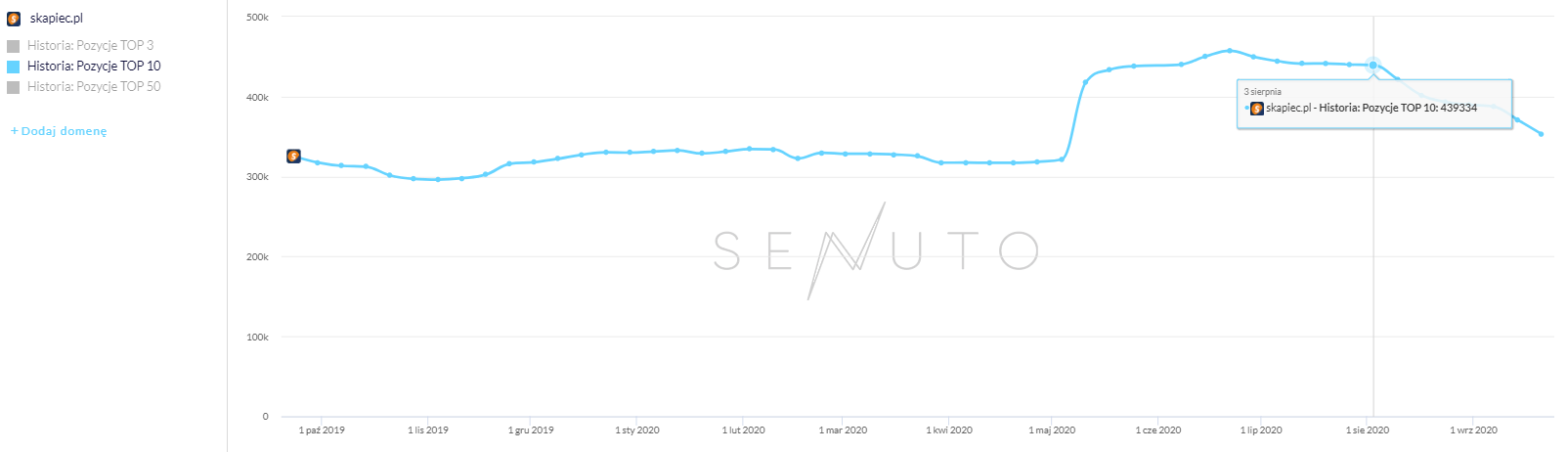 Widoczność w TOP10 serwisu Skapiec.pl spadła o ponad 11% w stosunku do początku sierpnia.