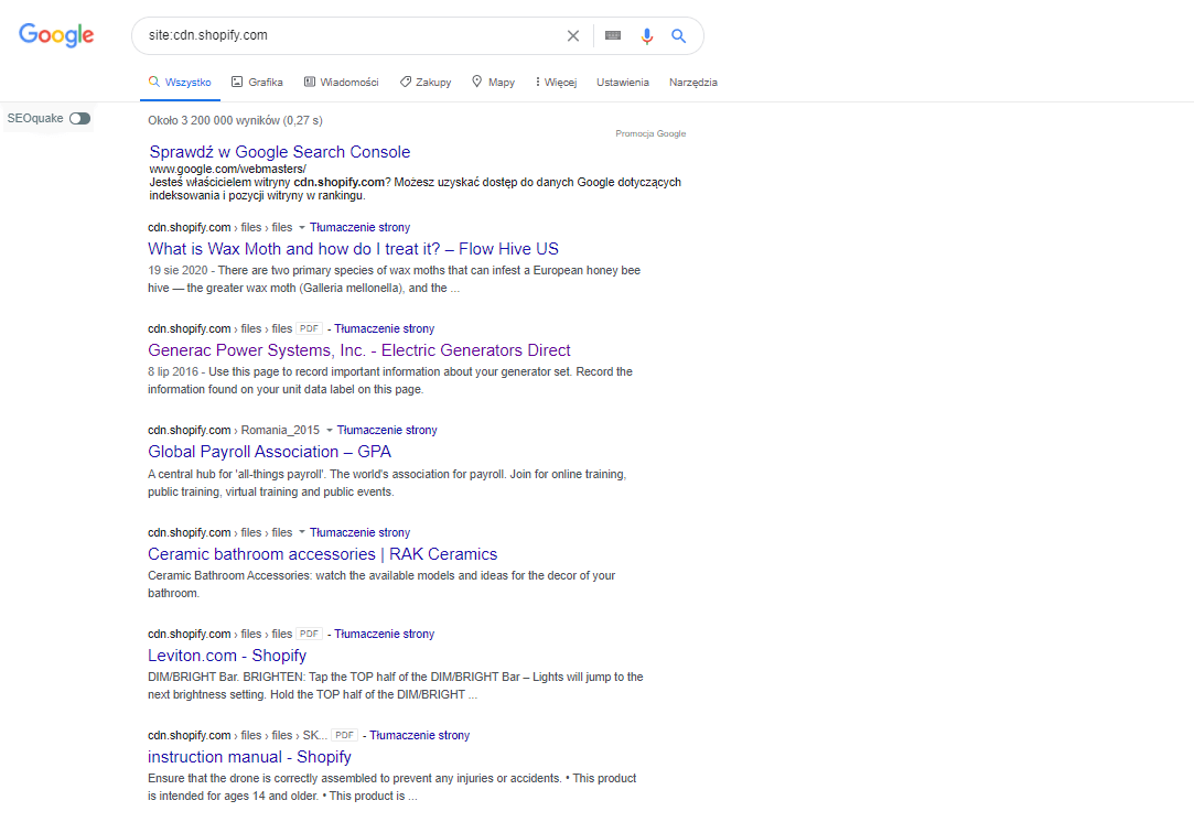 Subdomena Shopify.com zyskała ogromny wzrost widoczności. Mieszczą się one dodatkowe załączniki w PDF, które prawdopodobnie są załącznikami do produktów w sklepach Shopify.