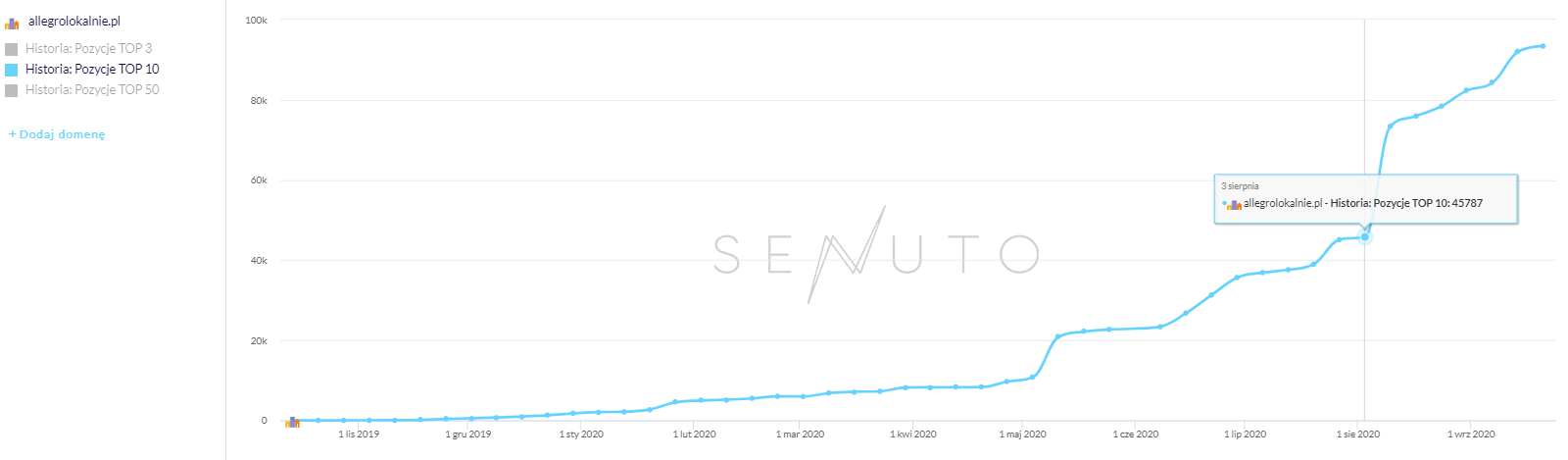 Jednym z serwisów, który odnotował duży wzrost liczby słów kluczowych w TOP10 (również procentowo), jest portal Allegrolokalnie.pl. Jest to wzrost po ponad 84% – miesiąc do miesiąca.