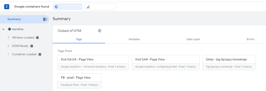 Karol pokazał nam również ciekawe wtyczki do Chrome, które mogą przydać się i ułatwić pracę marketerom w codziennej pracy z Google Tag Managerem. Oczywiście pracowaliśmy między innymi z podstawową wtyczką – Google Tag Assistant, ale nie tylko – tutaj zostawię pozostałe jako tajemnicę dla kolejnych uczestników szkoleń 🙂 Swoje poczynania w Google Tag Managerze: wszystkie tagi, reguły, zmienne sprawdzaliśmy również na “Podglądzie” w GTM. Dzięki temu mogliśmy w łatwy sposób weryfikować poprawność wprowadzanych zmian na koncie GTM.