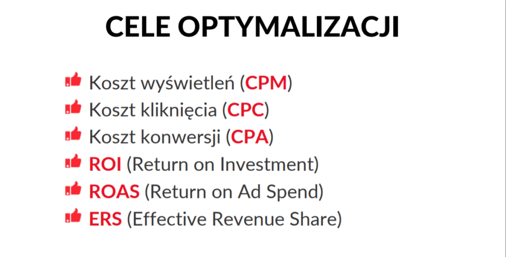 Podczas wprowadzenia zostały przypomniane podstawowe miary efektywności kampanii – KPI, ROAS, ERS, przychód, marża i zysk, których znajomość jest konieczna, aby przejść na wyższy poziom.