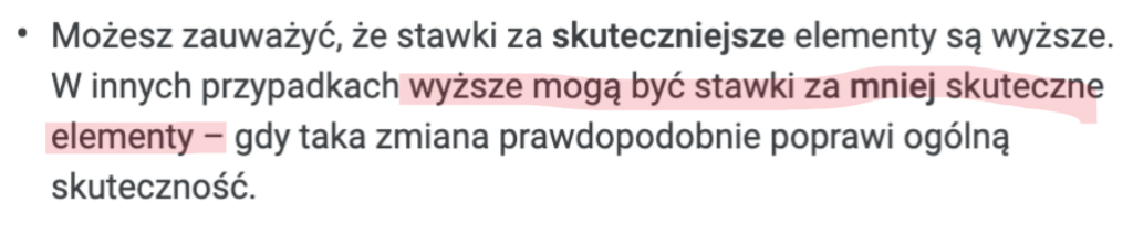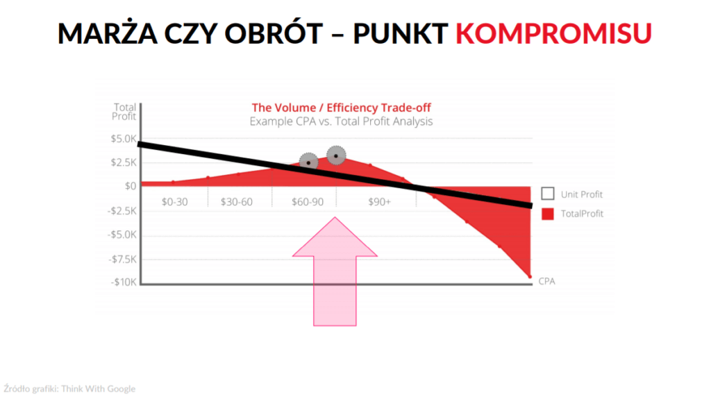 Chcąc pozyskać więcej konwersji, z reguły musimy wydać większy budżet. Przy takiej strategii koszt konwersji wzrasta. Klient pozyska więcej konwersji, ale po przemnożeniu ich przez przychód z konwersji oraz po odjęciu kosztów kampanii (które są wyższe) okaże się, że klient zarobił mniej niż gdyby zgodził się na mniej tańszych konwersji.