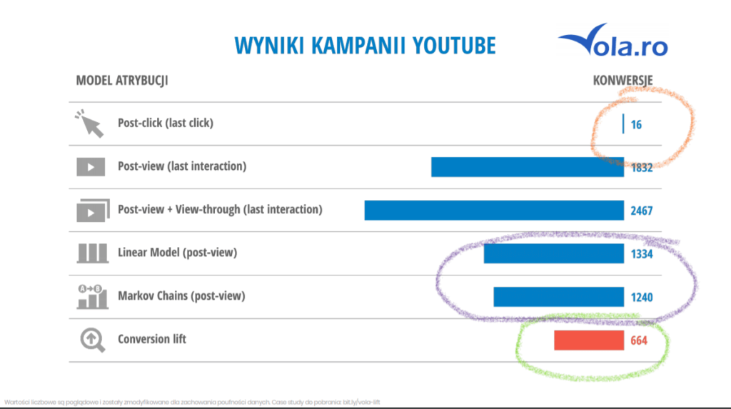 Jako przykład zostały porównane wybrane modele atrybucji, w których te same konwersje są w różny sposób przypisane do źródła. Pojawiły się modele atrybucji oparte o model Shapleya czy łańcuchy Markova.