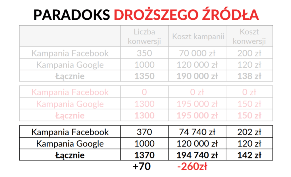 Prowadzi nas to do paradoksu droższego źródła, który to paradoks został wyjaśniony na zręcznym przykładzie droższych konwersji FB i tańszych Google Ads. Zwiększenie budżetu na kampanię z droższymi konwersjami (FB) przyczyniło się do uzyskania lepszego łącznego efektu, niż gdyby ten budżet został przeznaczony na kampanię z tańszymi konwersjami (Google Ads). Gdyby budżet został przeznaczony na kampanię z tańszymi konwersjami, wówczas koszt konwersji wzrósłby, a efekt końcowy byłby gorszy od zamierzonego.