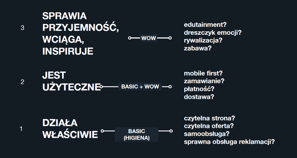 Przy projektowaniu należy pamiętać, że najpierwszym krokiem powinno być zminimalizowanie ryzyka wpadki w procesie zakupu, korzystania czy obsługi (usunąć wąskie gardła). Dopiero później powinno się przystępować do tworzenia dla klienta elementów nadzwyczajnego doświadczenia.
