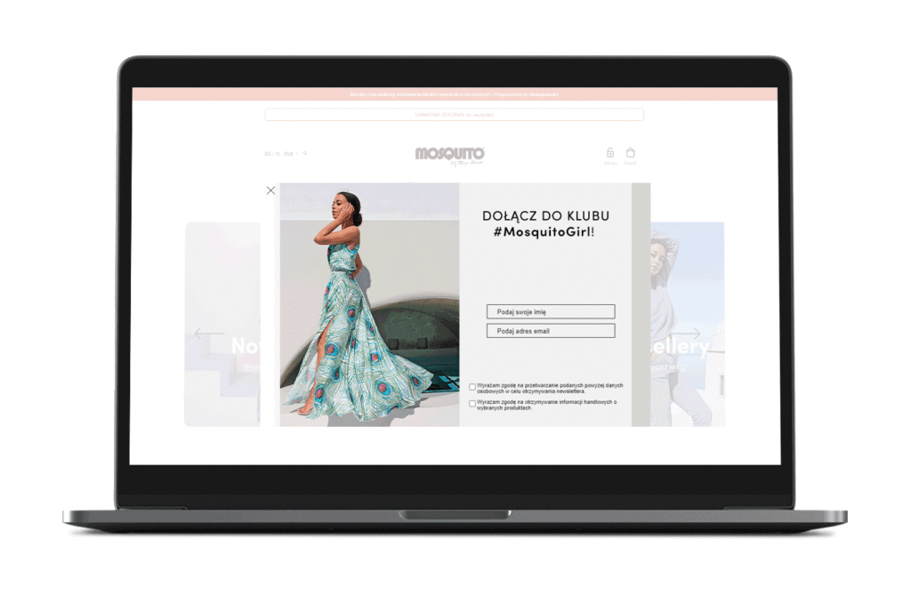 Po określonej akcji, na przykład kiedy klient wchodzi na stronę lub z niej wychodzi, na ekranie wyświetla się okienko z komunikatem. W ten sposób możesz zaprosić do subskrybcji newslettera, programu lojalnościowego albo poinformować o wyprzedaży.
