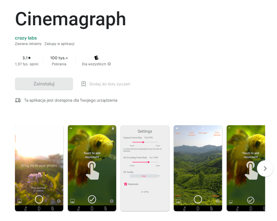 Cinemagraph to nie tylko aplikacja, to technika polegająca na zanimowaniu tylko jednego elementu zdjęcia, czy grafiki, podczas gdy inne pozostają nieruchome. Temu właśnie służy narzędzie o tej samej nazwie. Cinemagraph to jego wersja na Androida, ale jest też wersja na iOS’a, czyli Cinemagraph Pro.
