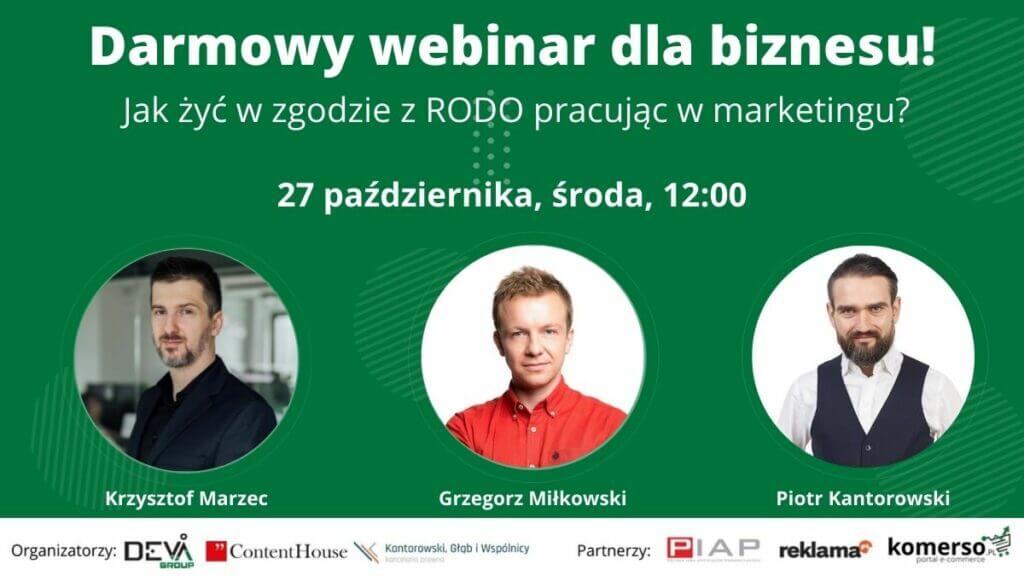 Pierwszy z naszych webinarów lubimy nazywać skondensowaną paczką wiedzy na temat Rodo w marketingu. Prelegentami będą Krzysztof Marzec (DevaGroup), Grzegorz Miłkowski (ContentHouse) oraz Piotr Kantorowski (Kancelaria Prawna Kantorowski, Głąb i Wspólnicy).