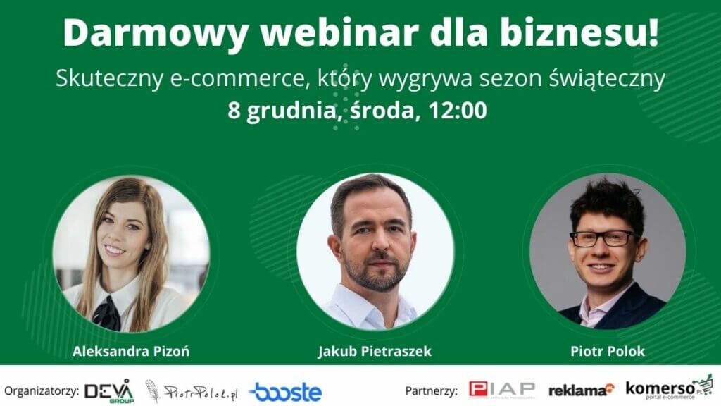 Oprócz webinaru mikołajkowego, w grudniu przyszykowaliśmy dla was jeszcze jedno spotkanie. Tym razem będzie ono poświęcone akcjom typowo świątecznym. W gronie prelegentów znajdziecie Aleksandrę Pizoń (DevaGroup), Piotra Poloka (PiotrPolok.pl) oraz Jakuba Pietraszka (Booste). Z webinaru dowiecie się m.in. jakie są wyzwania finansowe, stojące przed e-commerce w okresie przedświątecznym.