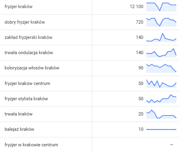 Stawiam dobrą 12 letnią whiskey na to, że w rozliczeniu za pozycję szybciej zobaczysz fakturę za kilka słów z dołu tego raportu, niż za frazę najważniejszą czyli “fryzjer kraków”. Weź również pod uwagę, że podane liczby to zapytania – nad pierwszą pozycją są nawet 4 reklamy. Klikalność w miejsca 3-10 może wynosić czasem tylko 1% tej liczby.
