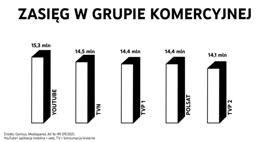 W Brandcast wprowadziła nas Iwona Piwek, Head of Video Sales w Google. YouTube w Polsce odwiedza ponad 25 milionów osób miesięcznie i wg badań Media Panel wyprzedza pod względem zasięgu stacje telewizyjne. Dodatkowo, badani na pytanie, których mediów brakowały by im najbardziej wskazują najczęściej na YouTube – aż 4x częściej niż na telewizję. (źródło: 2021 Talk Shoppe). 81% użytkowników twierdzi też, że YouTube ma unikatowe treści, których nie mogą znaleźć nigdzie indziej.